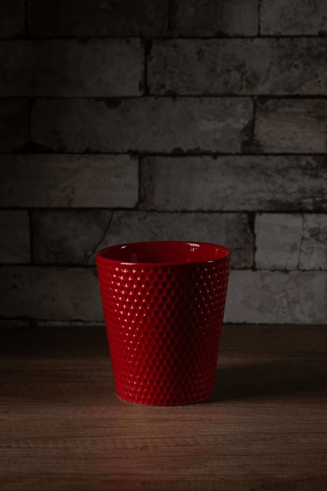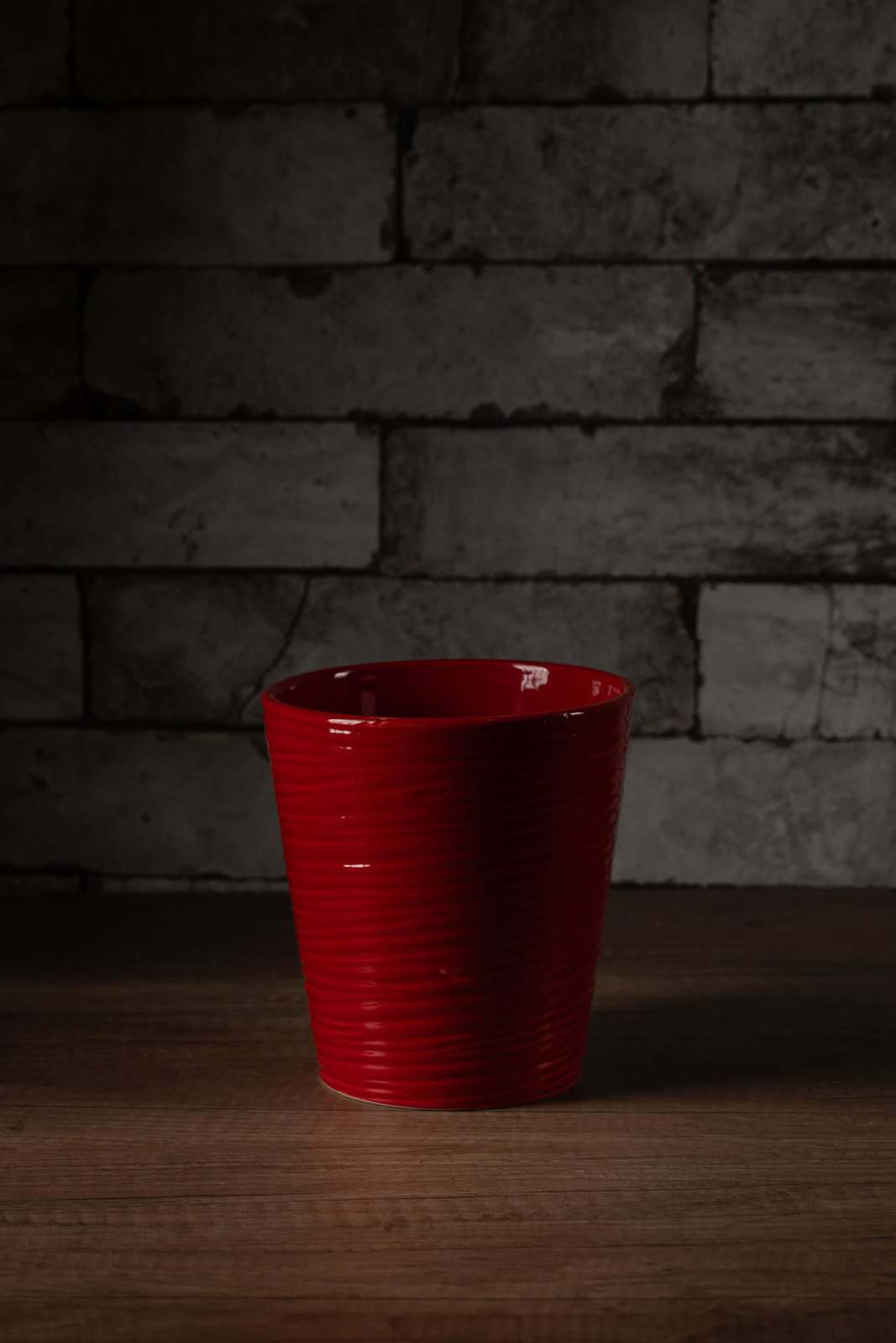 Κεραμικό κασπώ με ανάγλυφη υφή και κομψό κωνικό σχήμα. Η έντονη κόκκινη απόχρωση προσθέτει χαρακτήρα και ζεστασιά στη διακόσμηση.